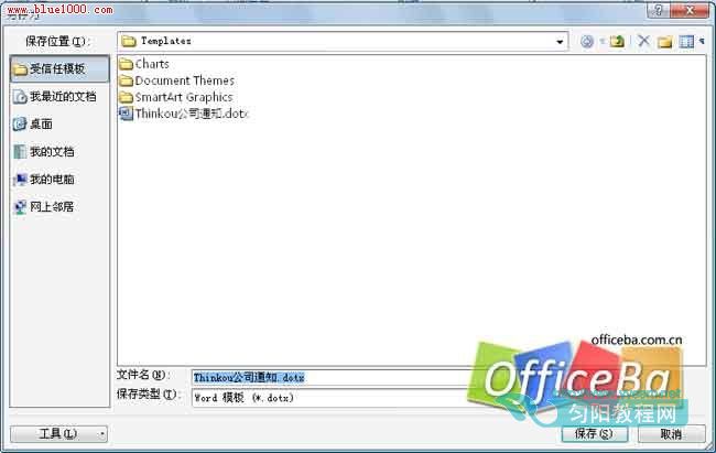 输入通知模板的名称,可以留意到在Word 2007中,模板的扩展名为.docx,单击“保存”按钮,如图7所示。注意不要更改模板保存路径。