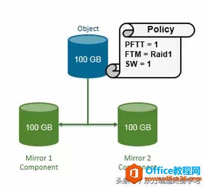 这些对象不是直接放在硬盘上,而是分成若干个组件的形式写入存储,这是为了实现RAID、性能以及可用性。具体的切分方式和存储策略相关,比如要实现RAID 1就将数据复制成两个组件来写(未计入Witness组件),既实现RAID 0又实现RAID 1则要4个组件。