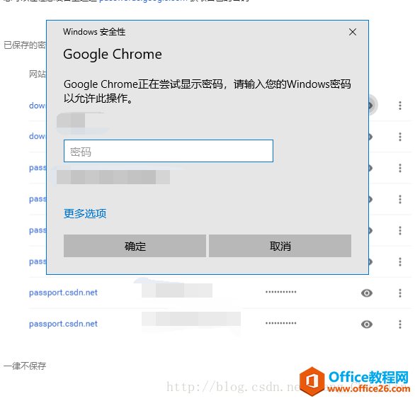 当我们要查看Chrome浏览器上保存的某一个密码时,点击“眼睛”图标,会弹出一个对话框来要求输入Windows密码来验证你的权限。所以用这种方法查看密码时必须知道Windows开机密码。