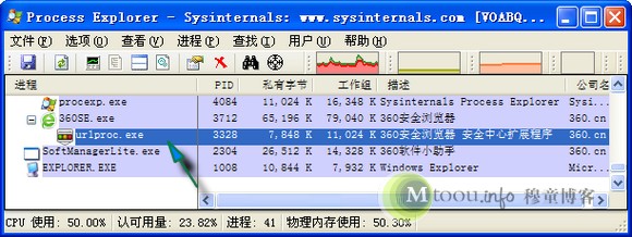由于urlproc.exe是360安全浏览器的一个组成部分,只要我们安装了这款浏览器urlproc.exe程序便会一起被安装到浏览器安装目录中,并在我们启动360安全浏览器的时候将其触发启动,此时我们就会在任务管理器中看到它,而当我们关闭浏览器时urlproc.exe便会一起被关闭。下图是微软Process Explorer工具对检测urlproc.exe进程的检测清楚显示了此进程与360se.exe进程(360浏览器主进程)的隶属关系。(延伸:spoolsv.exe是什么进程?)