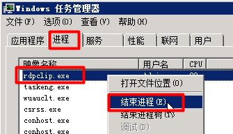 1、在远程服务器上启动任务管理器,在任务管理器的进程中找到rdpclip.exe进程,右键结束进程;