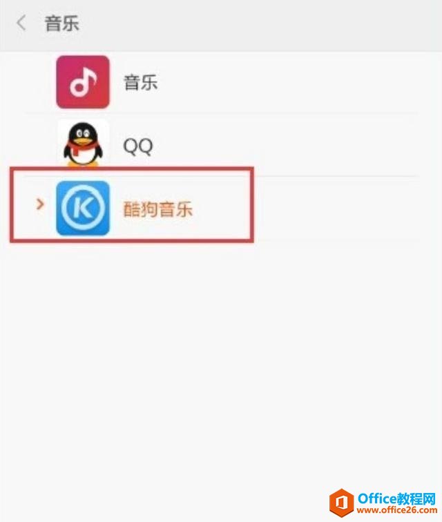 5.进入后就会发现小米手机中,音乐的默认打开应用是自带的音乐,这个时候只要点击想要更改的默认音乐应用,例如【酷狗】,即可一键更改默认应用啦!