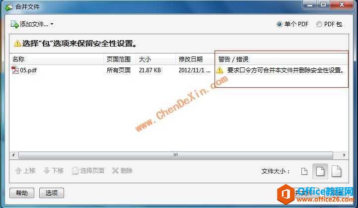 当你执行上面的操作时,就会在“合并文件”对话框中提示警告/错误“要求口令方可合并本文件并删除安全性设置”: