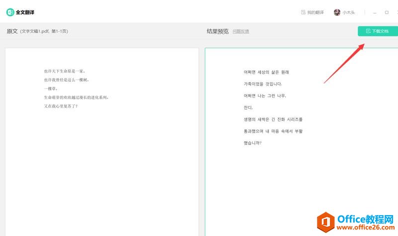 第三步:翻译后会出现预览界面显示翻译结果,如果需要将翻译文档保存,则点击右上角的下载文档即可,如下图所示: