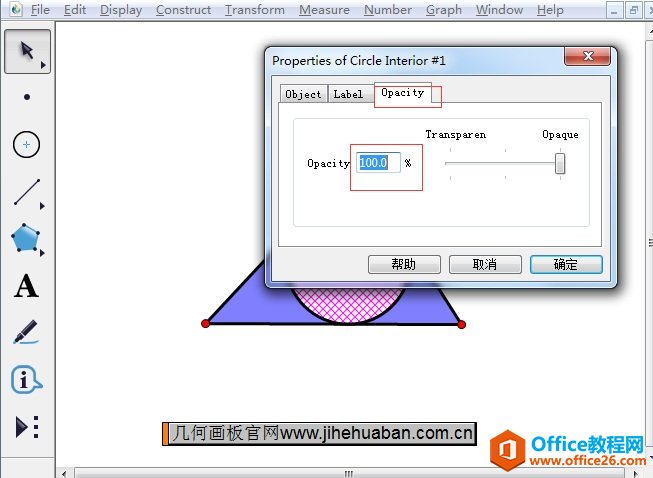 3.选中圆内部鼠标右击,单击属性,在弹出的对话框将不透明度,设置为100%(如下图所示),点击确定。然后隐藏有关点,再把三角形内部颜色变成黄色,就能得到所需要的几何图形。