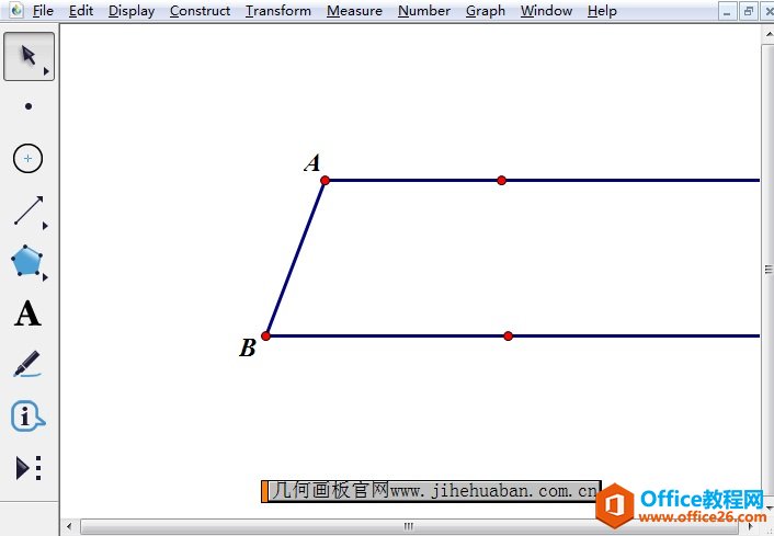 步骤一 画出腰AB和两底所在的射线。使用“点工具”在画板空白区域任意画两点,使用“射线工具”过两点分别画射线,如下图所示。