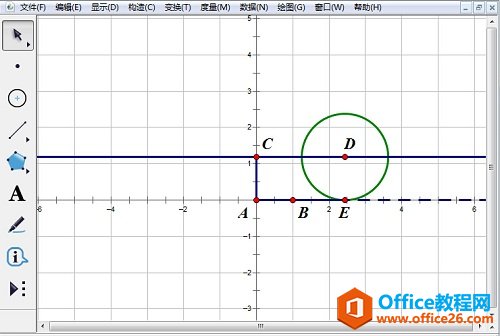 3.选择点A、C,选择“构造”—“线段”命令。以D为圆心,线段AC长为半径绘制出圆。使圆与X轴相较于点E。采用同样方法,构造线段AE。如下图所示。