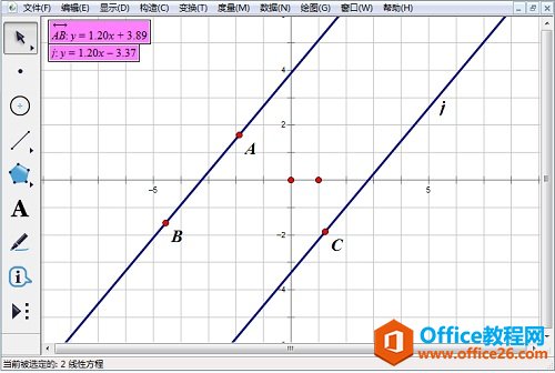 3.选中直线AB和过点C的AB的平行线,选择“度量”—“方程”命令,在绘图区的左上角就会出现关于两条直线之间关系的方程。当我们移动直线或点的时候,可以观察到方程的变化。