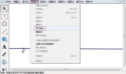 2.构造平行线。选中点M和线段AB,点击菜单“构造”——“平行线”,在平行线上任取两点C、D。