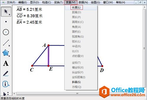 6.度量线段长度。分别选中线段AB、CD、AE,“度量”菜单下选择“长度”。