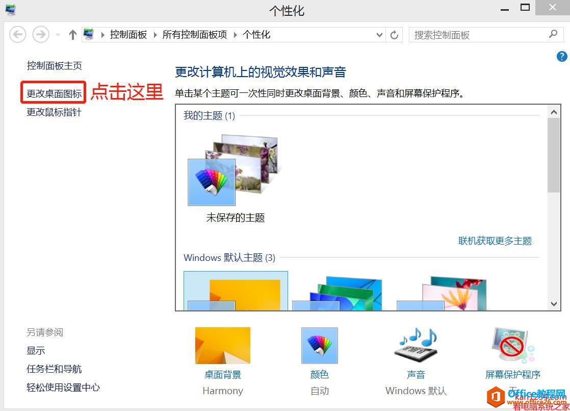 第二步:在弹出的个性化窗口中点击左上角的“更改桌面图标”