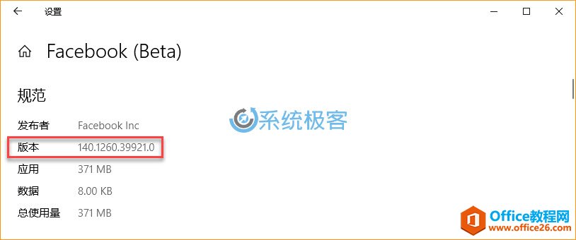 在「规范」下,您可以查看到应用程序的发行商、应用程序本身和数据所占用的磁盘空间大小。Windows 10 Version 1803 中还新增了对版本号的显示,在这里可以方便地得到当前使用的是否为最新版本。
