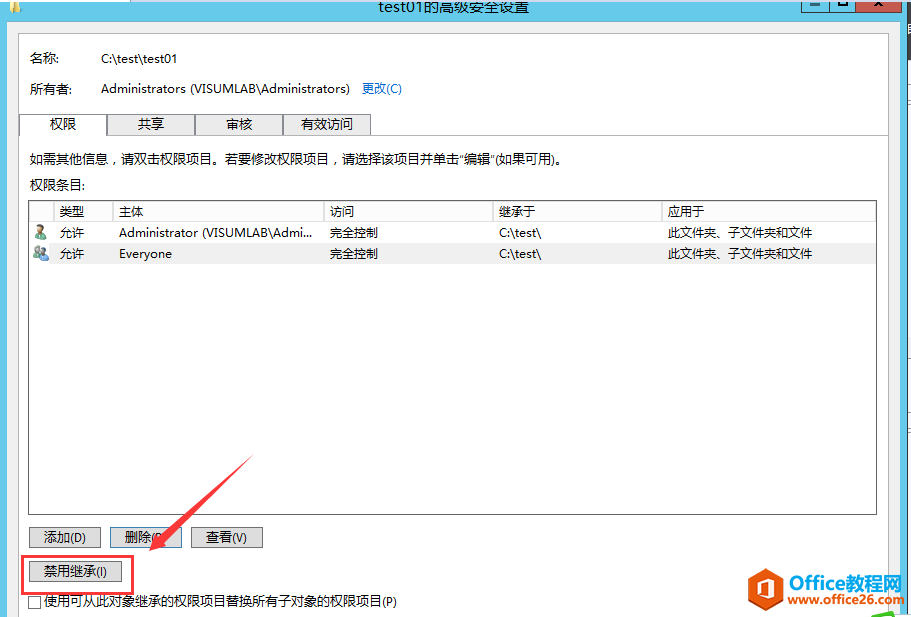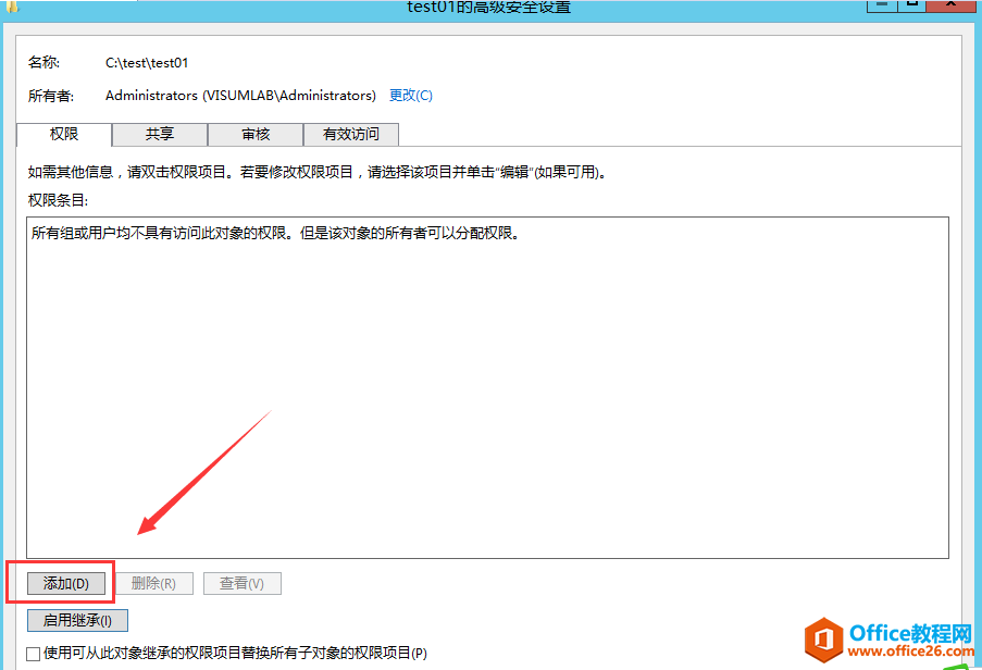 删除完成后,权限中没有任何的继承用户。然后再添加需要访问test的枚举权限的用户。