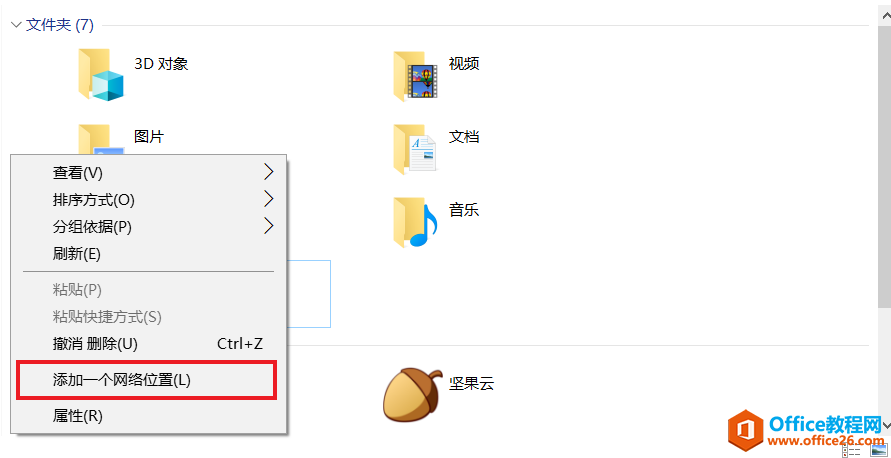 2.打开Windows的“此电脑”,在空白处右键,点击“添加一个网络位置”。