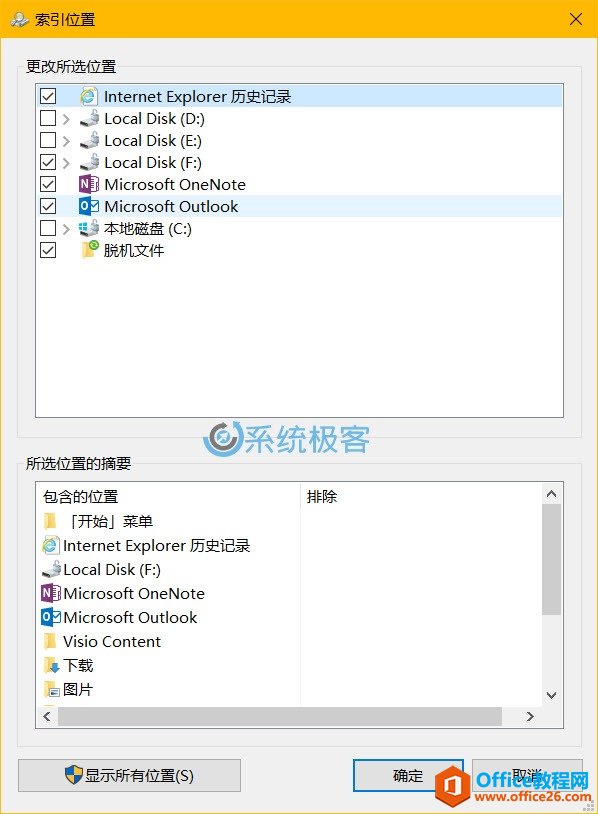 要添加或删除索引位置,在「索引选项」窗口底部的点击「修改」按钮进行勾选即可。