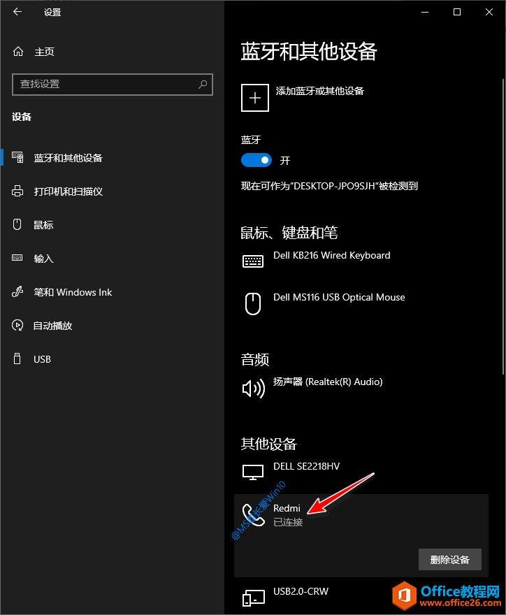 蓝牙配对连接之后,我们就可以在“Windows设置 - 设备 - 蓝牙和其他设备”设置界面的“其他设备”列表中看到显示为“已连接”的手机 Redmi 了。如图: