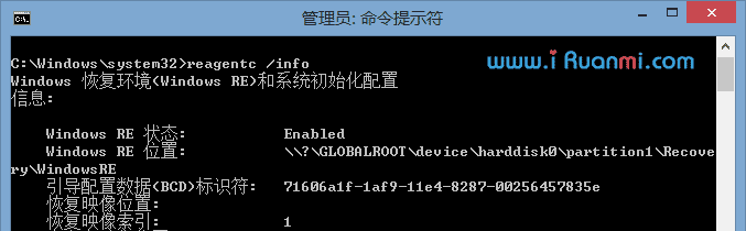鼠标右键单击屏幕左下角(或按Win+X组合键),打开“命令提示符(管理员)”。输入下面的命令,回车即可查看恢复环境配置信息