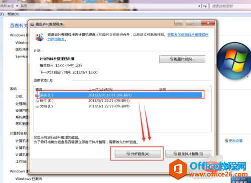 回分析出“C盘”的碎片为百分之一,要进行碎片整理,则选择C盘,然后点击“磁盘碎片整理”