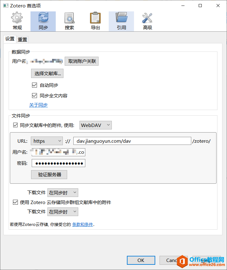 打开Zotero->编辑->首选项->同步->文件同步,使用Zotero改为使用WebDAV,填入如下图所示即可,填写成功后验证服务器,验证成功代表配置成功。(注意,如果采用下图填写方式,必须确保云盘根目录存在文件夹为zotero,没有自行创建)