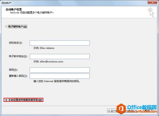 4. 在弹出页面选择【手动配置服务器设置或其他服务器类型】,点击【下一步】: