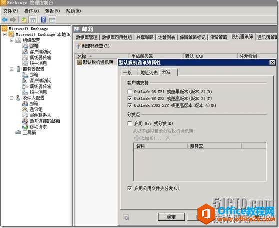 打开EMC—组织配置—邮箱—脱机通讯薄—右击 默认脱机通讯薄—属性—分发 选项卡和地址列表 选项卡