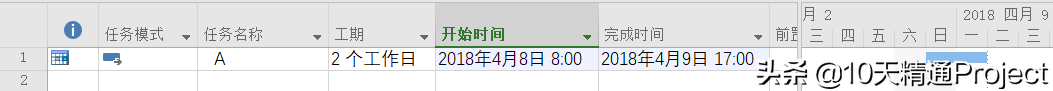 这时候任务A的开始时间已经自动变成了2018年4月5日的下一个工作日2018年4月8日,完成时间是2018年4月9日(星期一),如图2,这个计划是合理的。