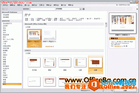当你打开Publisher 2007后,系统会弹出初始化窗口,在窗口的右侧用户会看到“ 出版物 类型”,其中包括很多常见的出版物和印刷品的名称,例如:菜谱、广告、海报、奖状、节目单、贺卡和新闻稿等等,在这个目录中我们还能看到 电子邮件 和网站两种类型。