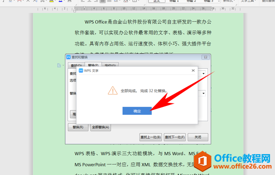 单击全部替换,就显示了文章完成了32处替换。将32处的半角全部替换成了全角。