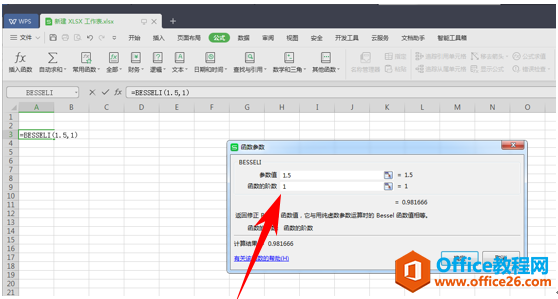 数值输入完成后,鼠标单击确定,便可在单元格内得到返回贝赛耳函数值(1.5 的 1 阶修正 Bessel 函数值)。