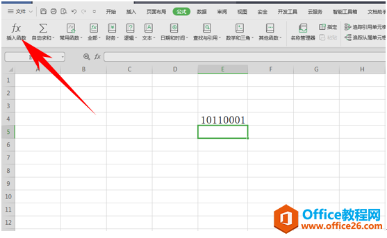 首先,我们在表格当中输入计算题,如下图10110001。要将此转换为十进制。单击工具栏公式下的插入函数。