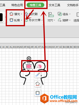 然后再从“形状”中挑一个圆形,给小猫抓画两个粉嘟嘟的肉垫出来~系统默认颜色是蓝色。我们可以通过“绘图工具”中的“填充”与“轮廓”来调整颜色。