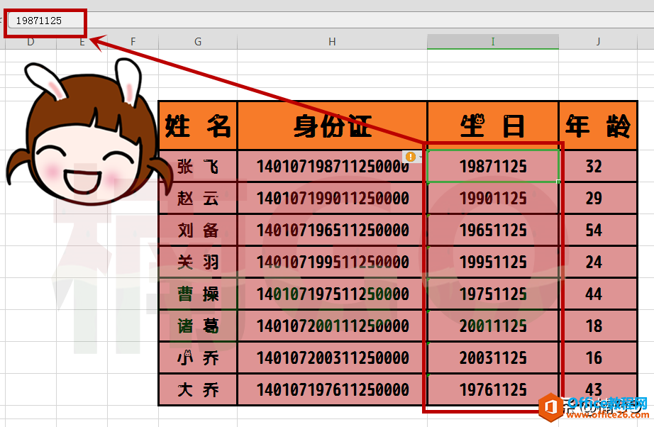 现在,让来我们再来点击生日单元格查看一看,是不是发现原来那烦人的固执公式已经消失不见了呢?取而代之的正是一串串普通的、贴心的、可以任我们随意修改复制的数字文本!而且,此时,就算我们删除掉整列身份证单元格,生日单元格中的内容也不会受到丝毫影响!