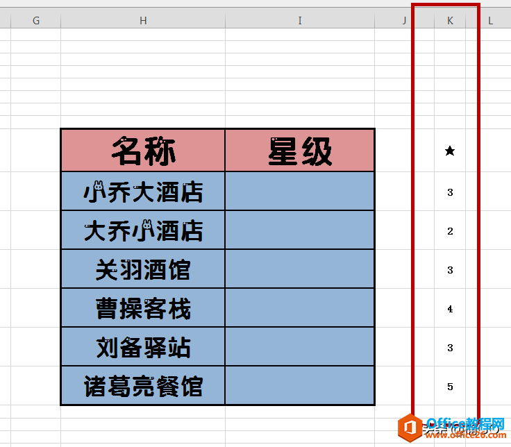 如下图所示,我们首先在任意一列空白单元格首行输入一个星形符号,然后再将数字评分逐一填入。(当然,星形符号也可以用任何符号代替)