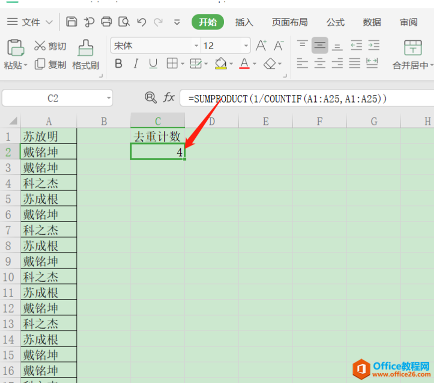 准确又高效的方法,就在直接在单元格C1中输入公式“=SUMPRODUCT(1/COUNTIF(A1:A25,A1:A25))”,公式的含义就是统计A1:A25单元格区域有A1至A25单元格数据的个数: