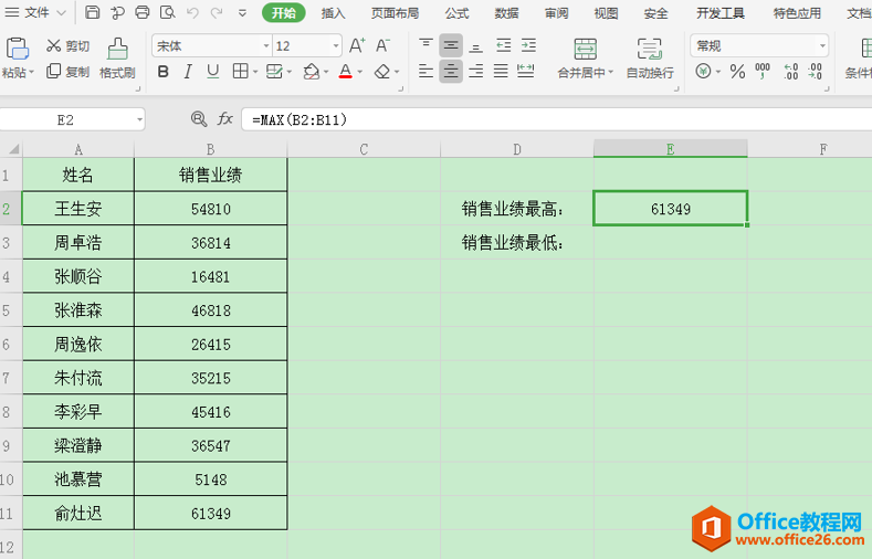 在E2中输入公式MAX(B2:B11),查找销售业绩中最高的数值,如下: