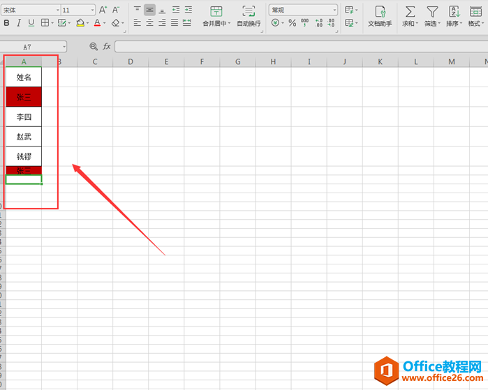 我们在设置好的区域范围,输入重复值,就会发现重复值所在单元格自动填充为红色: