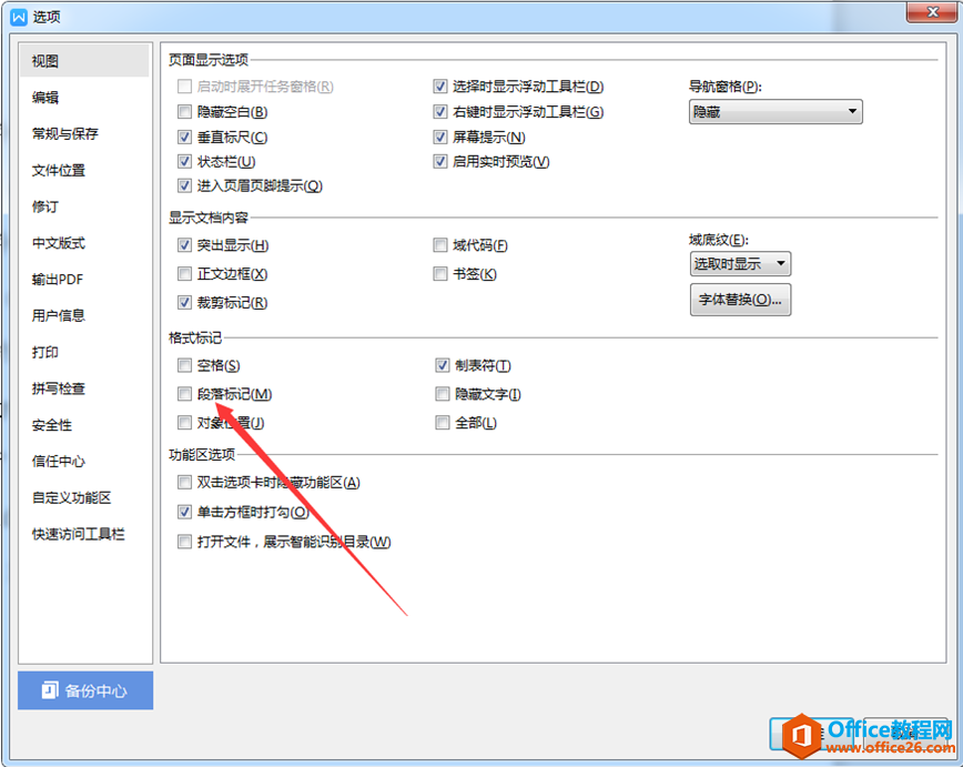 我们在弹出的选项对话框中,去掉“段落标记”处的“对号”: