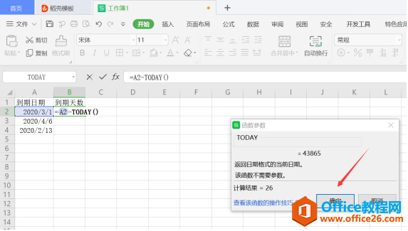 - 返回工作表中,我们看到B2单元格中已经计算出了到期天数,拖动鼠标下拉,剩余的“到期天数”即会自动计算出来: