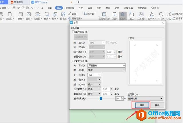 可以点击【插入水印】,进行水印内容、字体、字号、颜色、透明度等的设定,最后点击【确定】: