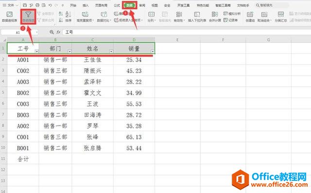 选中最上方第一行所有数据,点击工具栏上的【数据】,下拉菜单中选择【自动筛选】,这样每一列第一个单元格右下角都有一个三角形: