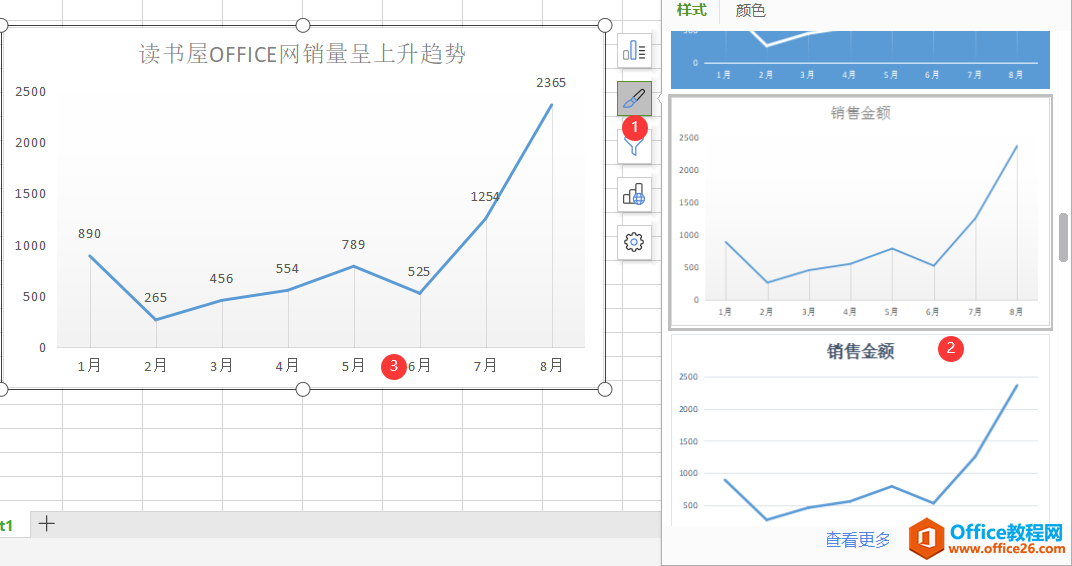 第四步:修改默认图表标题“销售金额”为“OFFICE教程网销量呈上升趋势”一般标题可以采用结论的方式,与图表默认样式,选定折线图表然后单击“图表样式”按钮,挑选一个WPS程序默认提供样式。