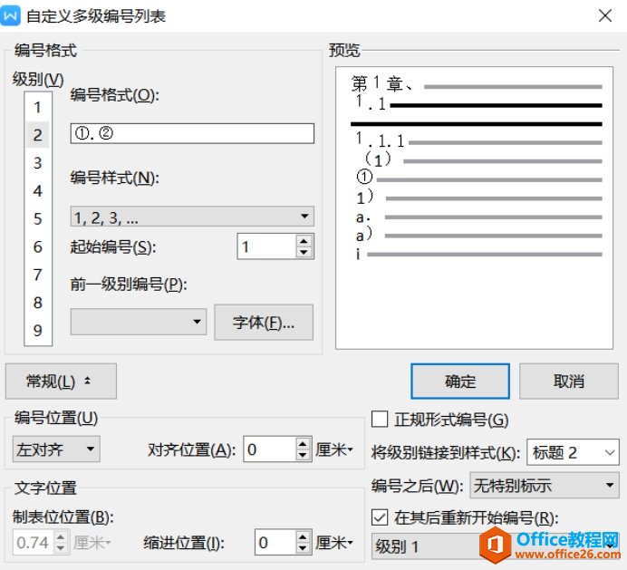 第二步:在多级编号选项下,选择预设的“第二个框”编号,然后单击“自定义”按钮,弹出一个“自定义多级编号列表”对话框,然后在该对话框先选择编号数字样式,WPS这里是个带圈的数字提示(表示这是可以自动的变化的编号数字,不要删除!不要删除!),在带圈数字的前后输入文字第与章。