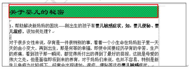 我们打开一个WPS文档来做范例,如图1这样的文档,我们可以为标题来加一个底纹和颜色,使这个文档更加的美观: