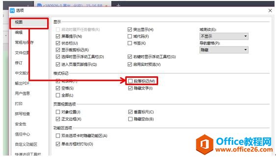 点开选项后,系统会自动弹出一个选项窗口,我们选择第一个视图工具,在右侧的窗口中把段落标记的对号勾选掉,如图: