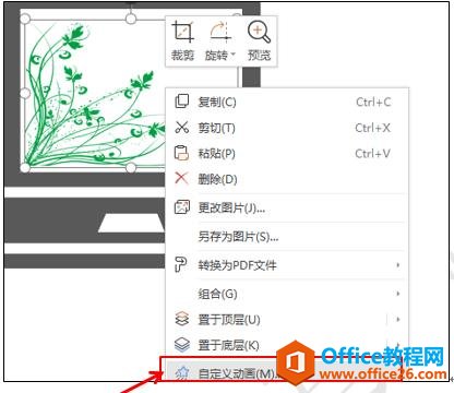 然后选中这个图片,点击鼠标右键在下拉菜单中选择自定义动画按钮,调出自定义动画菜单,如图4