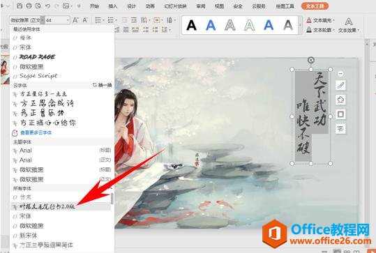 当我们制作关于武侠古风一类的幻灯片时,如何设置出古风或者诗文类型的文字呢,今天我们就来教大家这个小技巧,具体怎么操作呢,一起来学习一下吧。