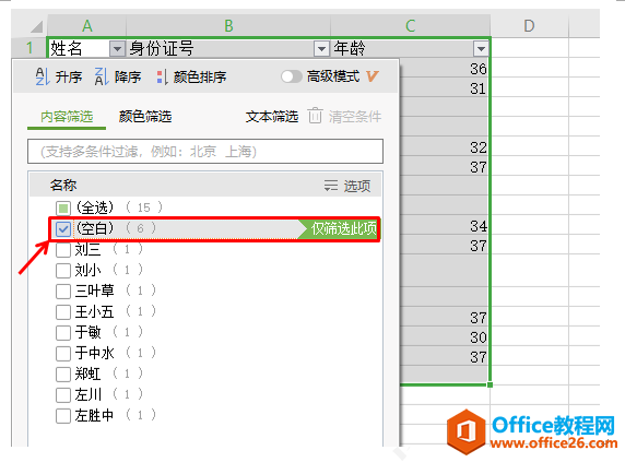 点击任何一个筛选下拉箭头,在下拉菜单中选择空白选项,如下图所示: