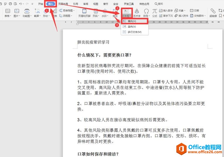 用鼠标点击工具栏上的【插入】选项,在下拉菜单中点击【文本框】,二级菜单中点击【横向】: