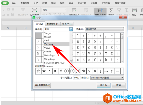 然后弹出符号的对话框,在字体的下拉菜单当中选择Verdana。