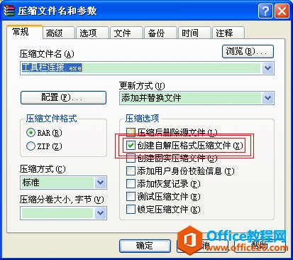 在压缩参数对话框中的“常规”选项卡中,勾选“创建自解压格式压缩文件”。